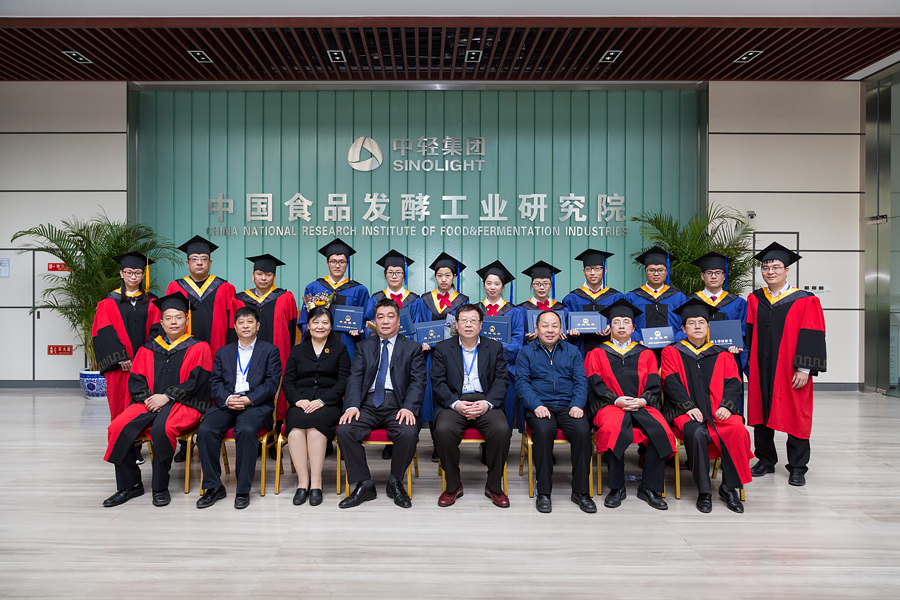 畢業典禮暨學位授予儀式在莊嚴的國歌聲中開始。隨后,王潔副書記宣讀了中國食品發酵工業研究院關于授予尹曼等8位同學工學碩士學位的決定。蔡木易院長在莊嚴而歡快的音樂聲中,為8位學位獲得者頒發畢業證書和學位證書,祝賀他們取得的成績,并為學子們“撥穗”,合影留念。