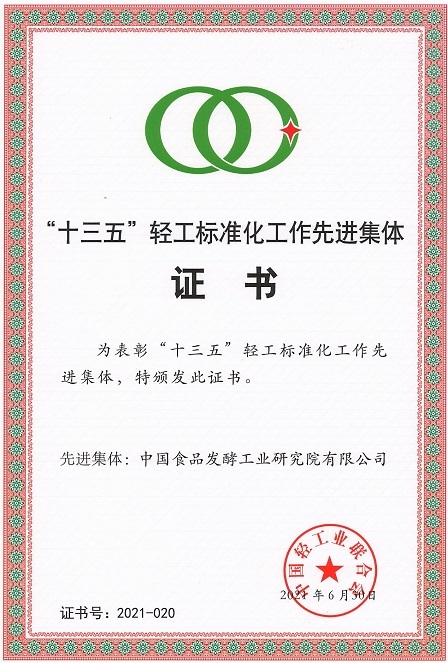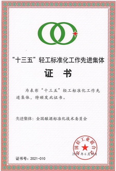7月6日,中國輕工業(yè)聯(lián)合會在北京召開“2021年度全國輕工行業(yè)標準化工作會議”,會上聯(lián)合會領導通報了“十三五”輕工標準化工作情況,宣讀了 “十三五”期間標準化工作表現(xiàn)突出的先進集體表彰文件。中國食品發(fā)酵工業(yè)研究院及全國釀酒標準化技術委員會雙雙榮獲“十三五”輕工標準化工作先進集體榮譽稱號。