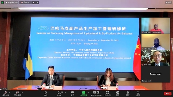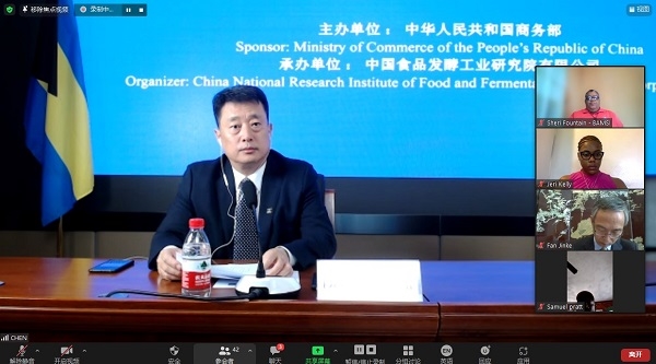 2021年9月6日,由國家商務部主辦、中國食品發酵工業研究院承辦的“巴哈馬農副產品生產加工管理研修班”成功舉辦了線上開班儀式。中國駐巴哈馬特命全權大使戴慶利、巴哈馬農業與海洋資源部常務秘書(副部級)喬爾·劉易斯、食品院總經理董建輝、中國駐巴哈馬經濟商務參贊樊金科出席了開班儀式,食品院總經理助理羅燕琴主持開班儀式。