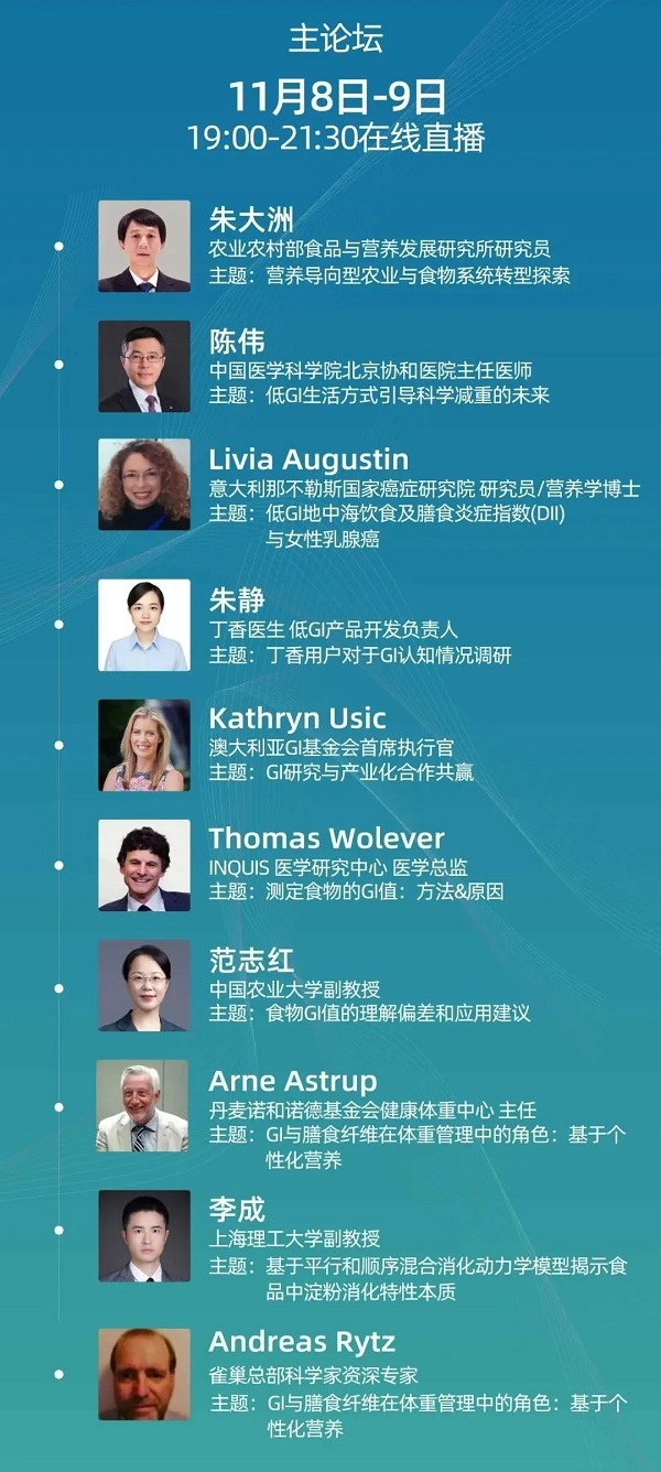 大會(huì)將由來自農(nóng)業(yè)農(nóng)村部、北京協(xié)和醫(yī)院、中國農(nóng)業(yè)大學(xué)、上海理工大學(xué),澳大利亞GI基金會(huì)、加拿大INQUIS醫(yī)學(xué)研究中心、丹麥諾和諾德基金會(huì)健康體重中心、意大利那不勒斯國家癌癥中心等GI領(lǐng)域國內(nèi)外行業(yè)大家和資深教授學(xué)者分享前沿新知,以及來自丁香醫(yī)生、雀巢等GI行業(yè)的企業(yè)代表分享多領(lǐng)域行業(yè)進(jìn)展及研究新知。