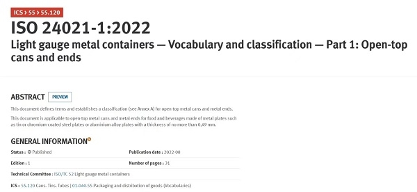 2022年8月26日,由中國(guó)食品發(fā)酵工業(yè)研究院有限公司聯(lián)合國(guó)內(nèi)相關(guān)企事業(yè)單位研制的ISO 24021-1:2022 Light gauge metal containers — Vocabulary and classification — Part 1: Open-top cans and ends《薄壁金屬容器-詞匯和分類(lèi)-第1部分:開(kāi)頂罐和蓋》國(guó)際標(biāo)準(zhǔn)正式發(fā)布,該標(biāo)準(zhǔn)是我國(guó)主導(dǎo)完成的第二項(xiàng)薄壁金屬容器領(lǐng)域國(guó)際標(biāo)準(zhǔn)。