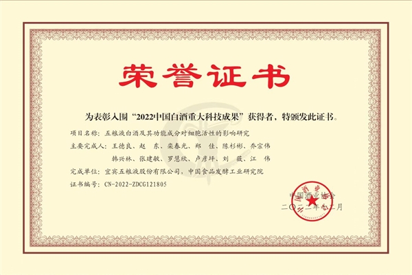 2022年12月17日上午,中國酒業協會在“酒都宜賓和美世界”2022中國國際名酒博覽會(簡稱“酒博會”)上發布了“2022年中國白酒重大科技成果”,中國食品發酵工業研究院有限公司、國家酒類品質與安全國際聯合研究中心(ICAB)與五糧液股份有限公司合作的科研項目“五糧液白酒及其活性成分對細胞活性的影響研究”榮獲“2022年中國白酒重大科技成果”,這是中國食品院聯合國際國內研發團隊在開展酒與健康科學研究以來獲得的又一殊榮。