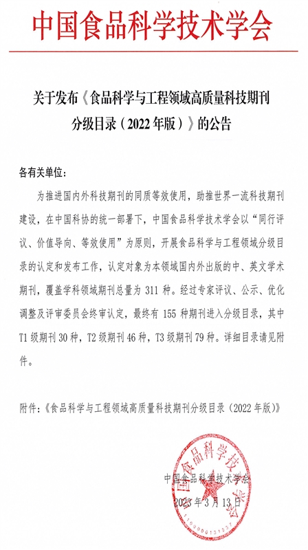 為貫徹落實習近平總書記關于“辦好一流學術期刊”的重要指示精神,推動科技期刊邁向世界一流水平,2022年8月,中國食品科技學會按照中國科協、中宣部、教育部、科技部聯合印發的《關于深化改革培育世界一流科技期刊的意見》部署,啟動《食品科學與工程領域高質量科技期刊分級目錄》的認定工作。經過包括7位院士在內的全國207位專家經嚴格審定,最終認定17個國家和地區的155種期刊入選《目錄》。入選期刊分為T1、T2和T3三個級別,T1類表示已經接近或具備國際頂級水平的期刊,T2類是指具有較高水平的國際知名期刊,T3類指為學術界所認可的國內外優質期刊。其中T1類不超過入選《分級目錄》期刊總量的20%。其中最高等級T1類期刊30種,含24種英文期刊和6種中文期刊,《食品與發酵工業》成為唯一一份成功入選的由中央企業主辦的食品領域期刊。