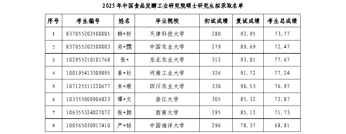 根據《中國食品發酵工業研究院2025年碩士研究生招生復試錄取工作方案》相關要求,現將中國食品院2025年碩士研究生擬錄取名單進行公示。如有意見,請在公示期內通過書面形式向中國食品院反映。