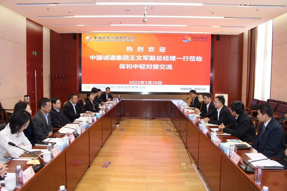 3月28日下午,保利中輕黨委副書記、董事、總經理王珂靈在中國食品發酵工業研究院會見中國誠通控股集團有限公司副總經理王文軍一行,雙方就加強科技服務、工程全過程服務、股權處置和資本運作等方面合作進行了深入交流。