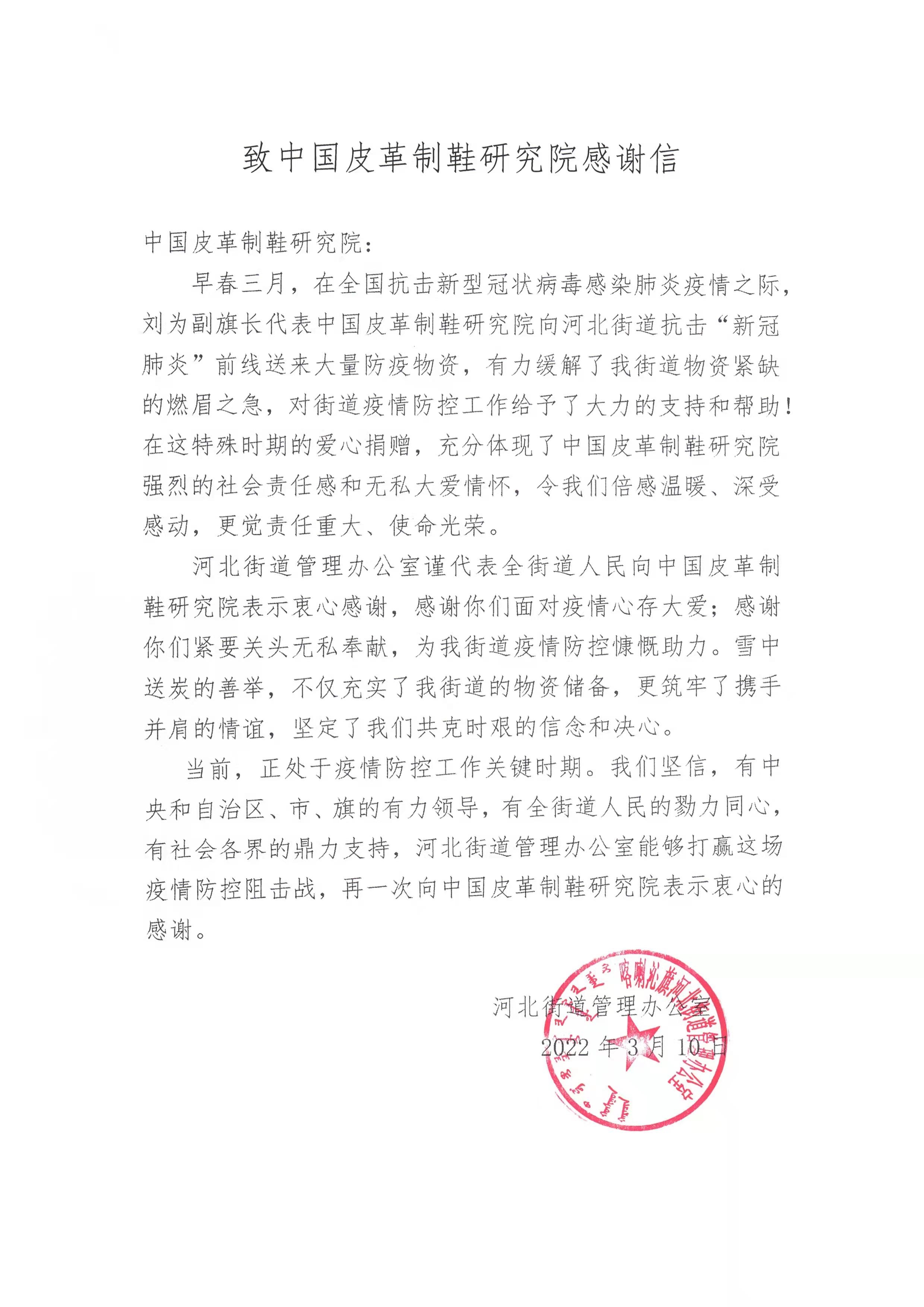 為助力內蒙古喀喇沁旗渡過疫情難關,中國皮革制鞋研究院向喀喇沁旗河北街道捐贈了400套防護服,并收到河北街道發來的感謝信。