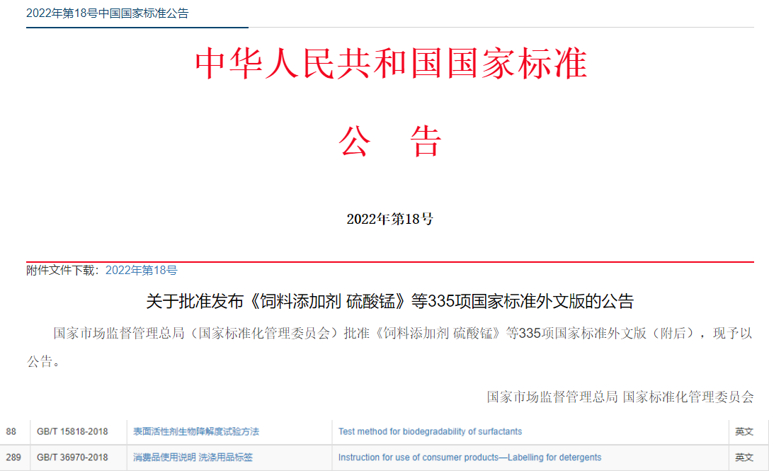 中國日用化學(xué)研究院制修訂的《手洗餐具用洗滌劑》《衛(wèi)生潔具清洗劑》等11項(xiàng)國家標(biāo)準(zhǔn)及《表面活性劑生物降解度試驗(yàn)方法》《消費(fèi)品使用說明 洗滌用品標(biāo)簽》2項(xiàng)國家標(biāo)準(zhǔn)外文版獲批發(fā)布。