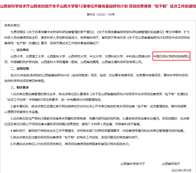 中國日用化學(xué)研究院獲批成為山西省基礎(chǔ)研究計(jì)劃項(xiàng)目經(jīng)費(fèi)使用“包干制”試點(diǎn)單位 。中國日用化學(xué)研究院將以此為契機(jī),加大科研投入,激發(fā)科研人員創(chuàng)造活力,不斷提升創(chuàng)新能力。