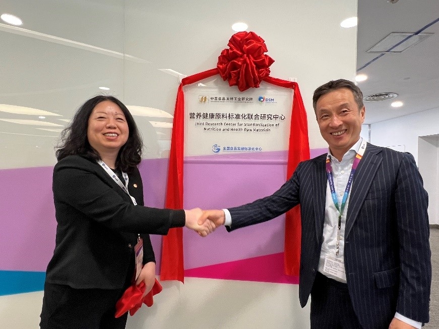 簽約儀式后,肖丹帶隊到帝斯曼(中國)總部和研發中心進行考察對接,參觀帝斯曼中心實驗室,并為“營養健康原料標準化聯合研究中心”揭牌。