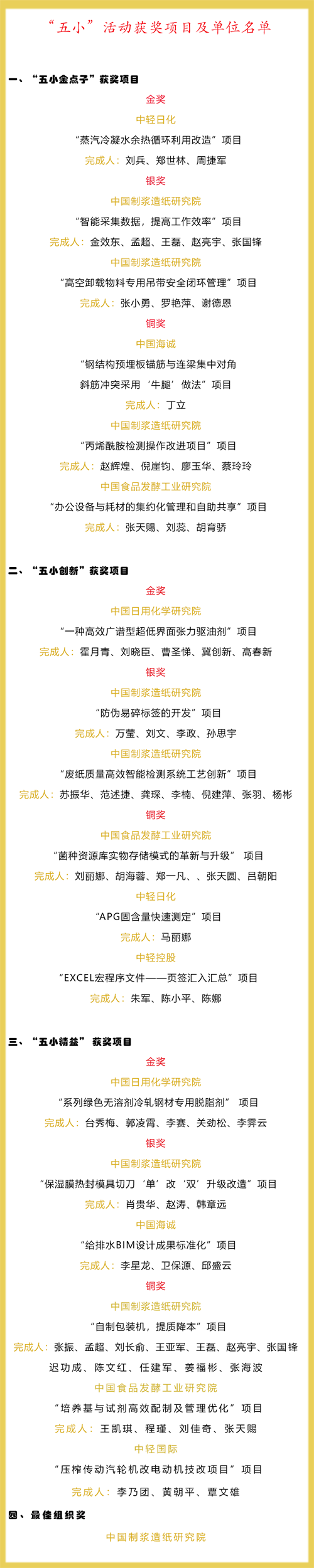 下一步,保利中輕將繼續以“五小”創新為抓手,積極引導廣大干部職工樹立“時時可創新、處處可創新、人人可創新”理念,立足本職崗位,充分發揮聰明才智,以小創“新”、以小增“效”,為公司高質量發展注入源源不斷的生機活力。