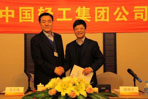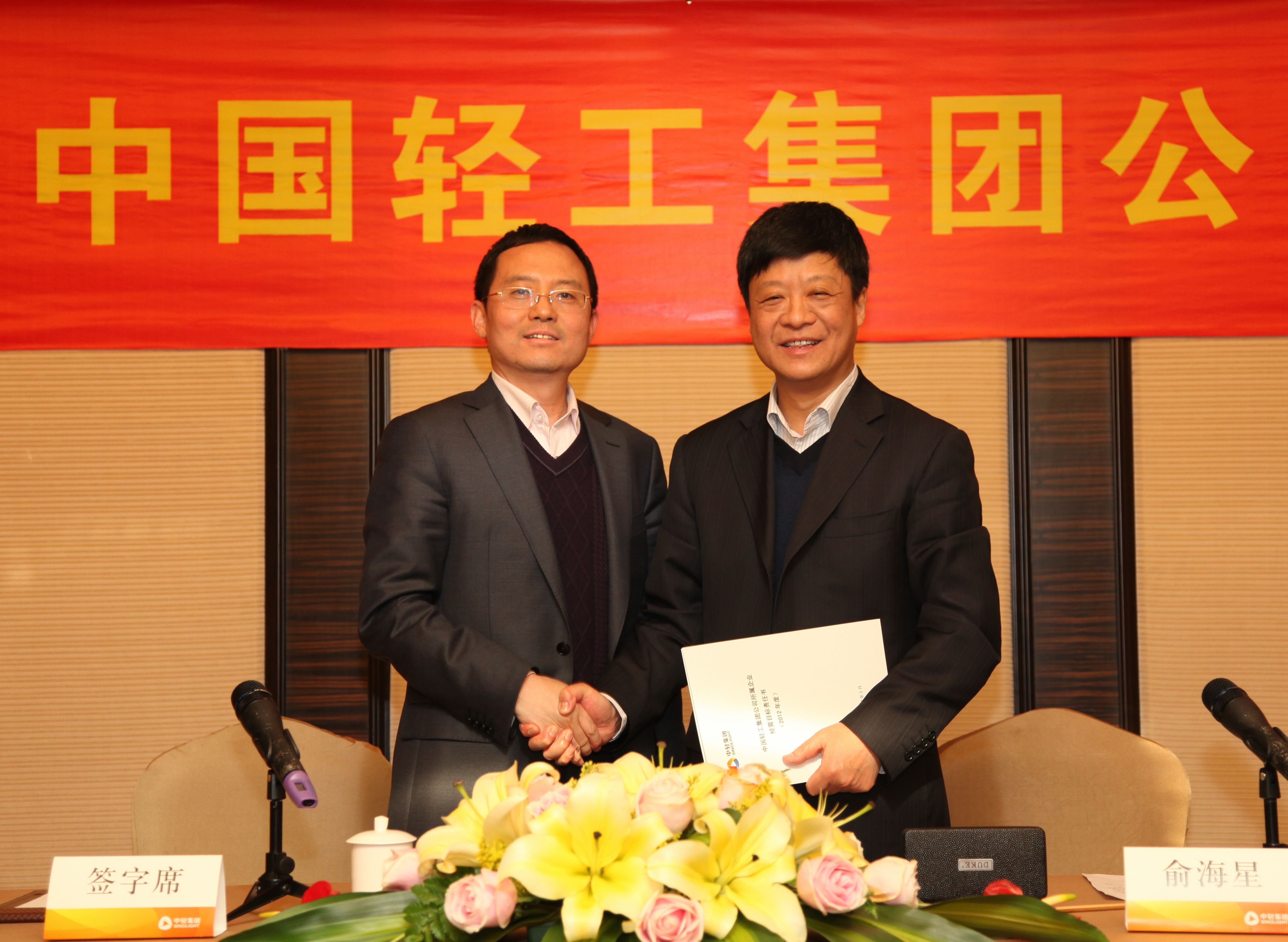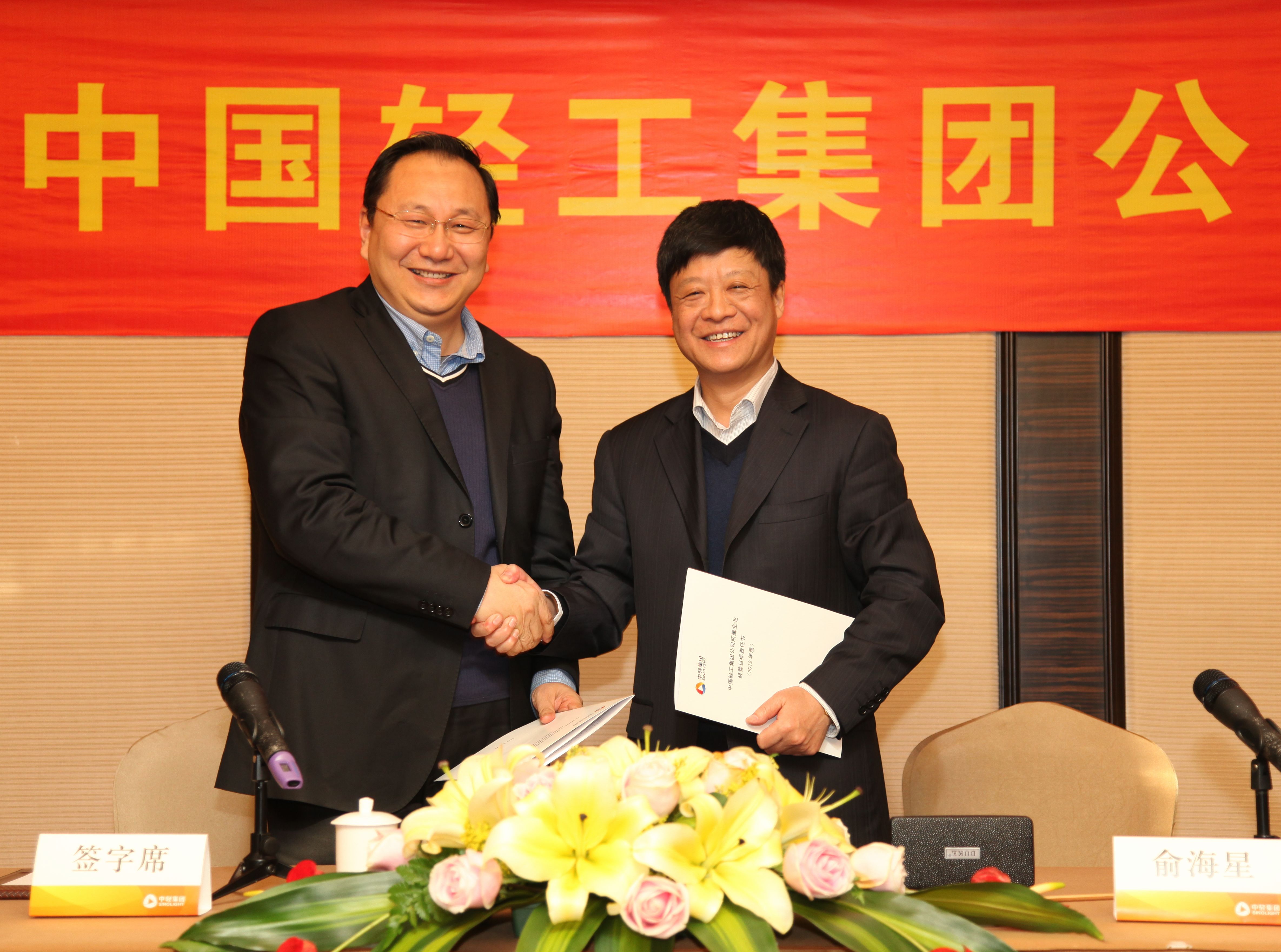 俞海星總經(jīng)理與中輕對(duì)外公司總經(jīng)理王向陽(yáng)簽訂責(zé)任書