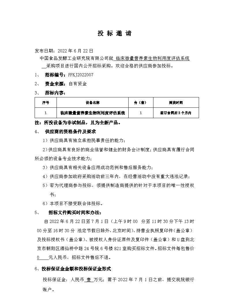 臨床微量營養素生物利用度評估系統采購項目(FFKJ2022007)國內公開招標采購