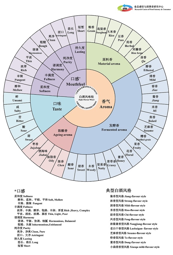 1、《白酒感官品評(píng)術(shù)語(yǔ)》(GB/T 33405-2016):在感官認(rèn)知規(guī)范及表達(dá)語(yǔ)言研究方面,通過(guò)對(duì)國(guó)際酒類(lèi)風(fēng)味輪術(shù)語(yǔ)制定過(guò)程論證,搜集整理了一千余條專(zhuān)業(yè)品酒師評(píng)酒用語(yǔ);研究分析了消費(fèi)者對(duì)白酒的描述用語(yǔ)和認(rèn)知習(xí)慣,篩選獲得“醬香、糧香、焦香、酸香、甜香、果香、花香、米香、油脂味、生青味”等特征描述術(shù)語(yǔ)。整理了原料香、發(fā)酵香、陳釀香三大類(lèi)27個(gè)典型香氣特征,柔和度、豐滿度、諧調(diào)度、純凈度、持久度等五大口感維度及多種口味特征,研究形成“中國(guó)白酒風(fēng)味輪”術(shù)語(yǔ)的基本框架及主要內(nèi)容,以促進(jìn)傳統(tǒng)白酒感官品評(píng)用語(yǔ)的規(guī)范化及標(biāo)準(zhǔn)化。